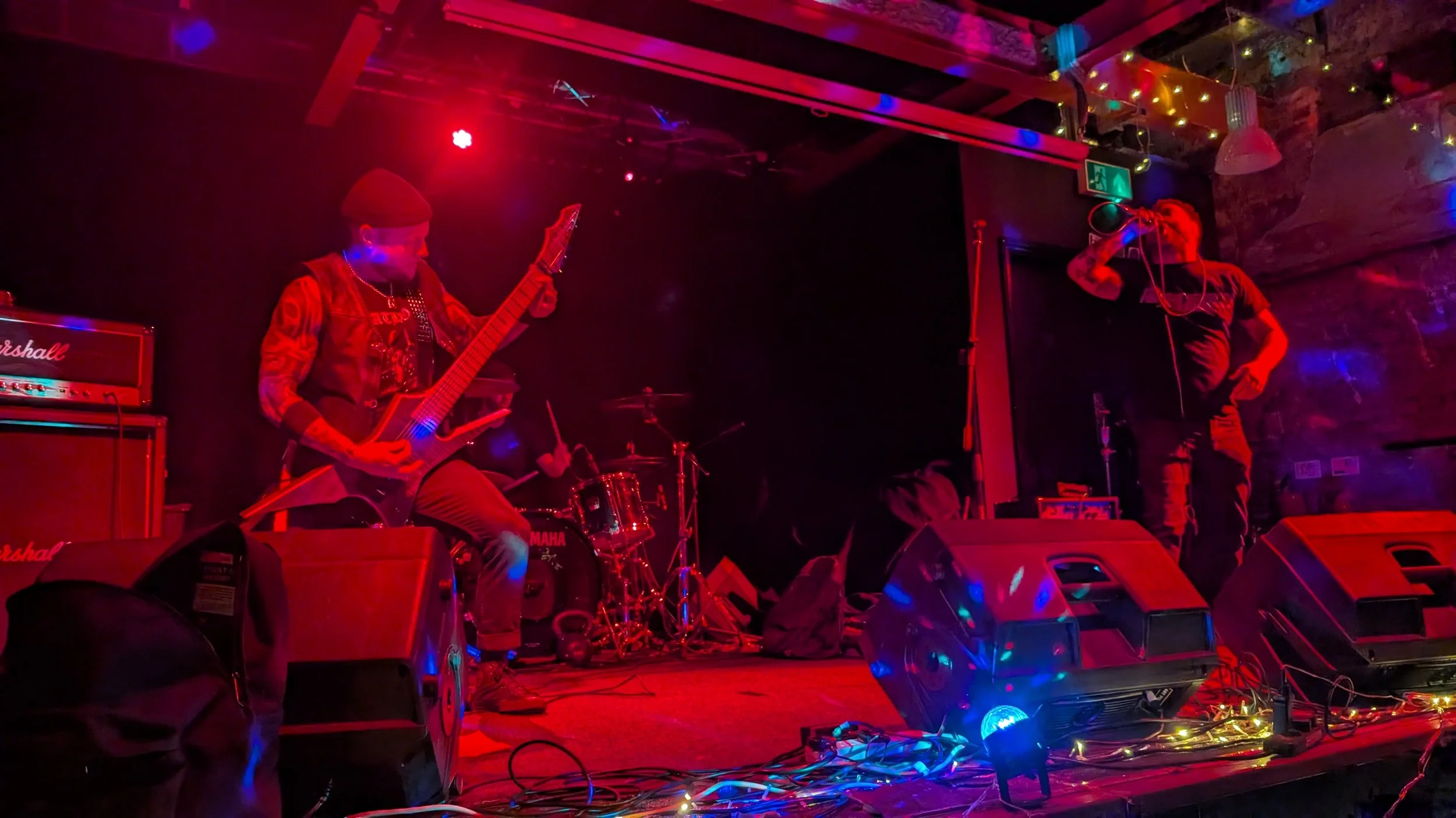 "Forwards you sexy *****" says the frontman. Good Lord almighty - it's a loud one. After the bands opening song "Mouths Like Open Graves", it turns out that an amp, behind frontman Chris, wasn't actually switched on. Mid-song, Guitarist Rob calmly strolls across the stage and nicely turns it on. Now we're really in Sludgeland. Social Youth Cult took us six-feet deep; Yersin have dragged us straight to Hell. Frontman Chris' shirt reads 'Sniff Glue, Worship Satan' on the back. Guitarist Rob, like a character out of Brütal Legend, plays with legs wide open to accommodate his hefty eight-stringed guitar. Mal, on drums, plays coolly at the back of the stage. The sound is as wide as it is loud - it's inescapable.