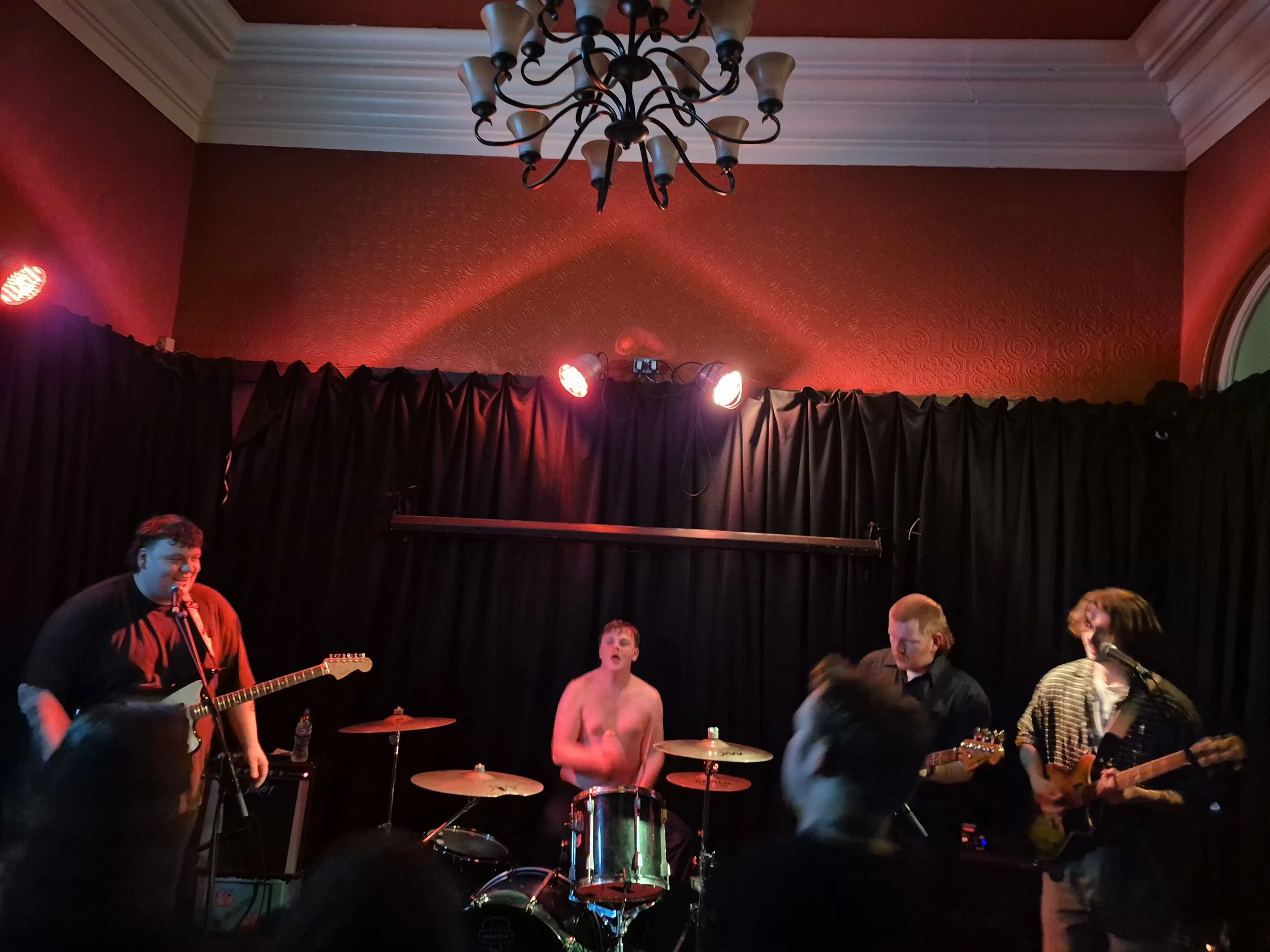 Frontman Ben takes his jacket off. Someone in the audience says "yes, get yer claes off”.